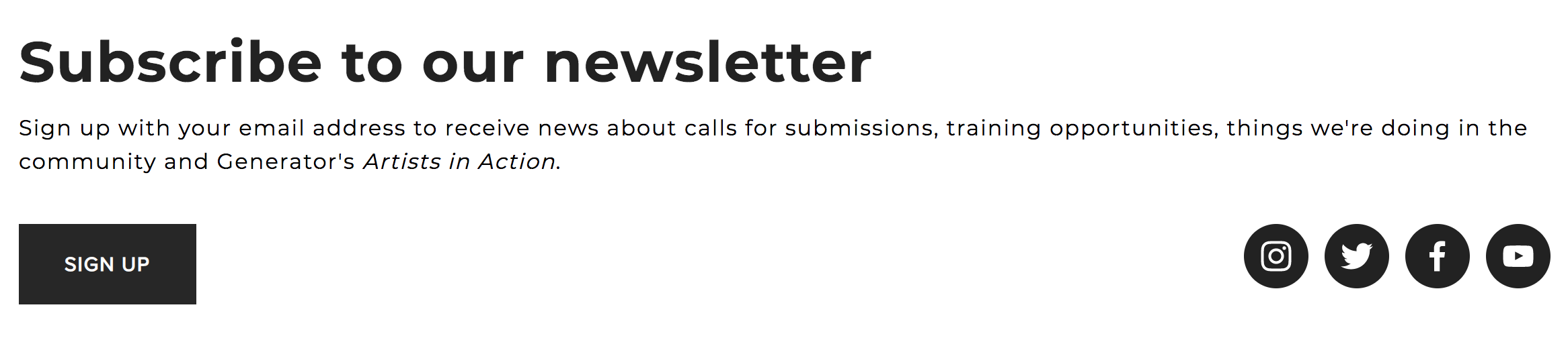 A website screenshot displays the text 'Subscribe to our newsletter Sign up with your email address to receive news about calls for submissions, training opportunities, things we're doing in the community and Generator's Artists in Action.' with a button that says 'SIGN UP' and social media icons for Facebook, Twitter, Instagram and YouTube.