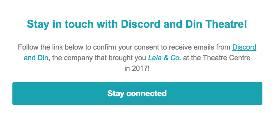 An email screenshot displays the text 'Stay in touch with Discord and Din Theatre! Follow the link below to confirm your consent to receive emails from Discord and Din, the company that brought you Lela