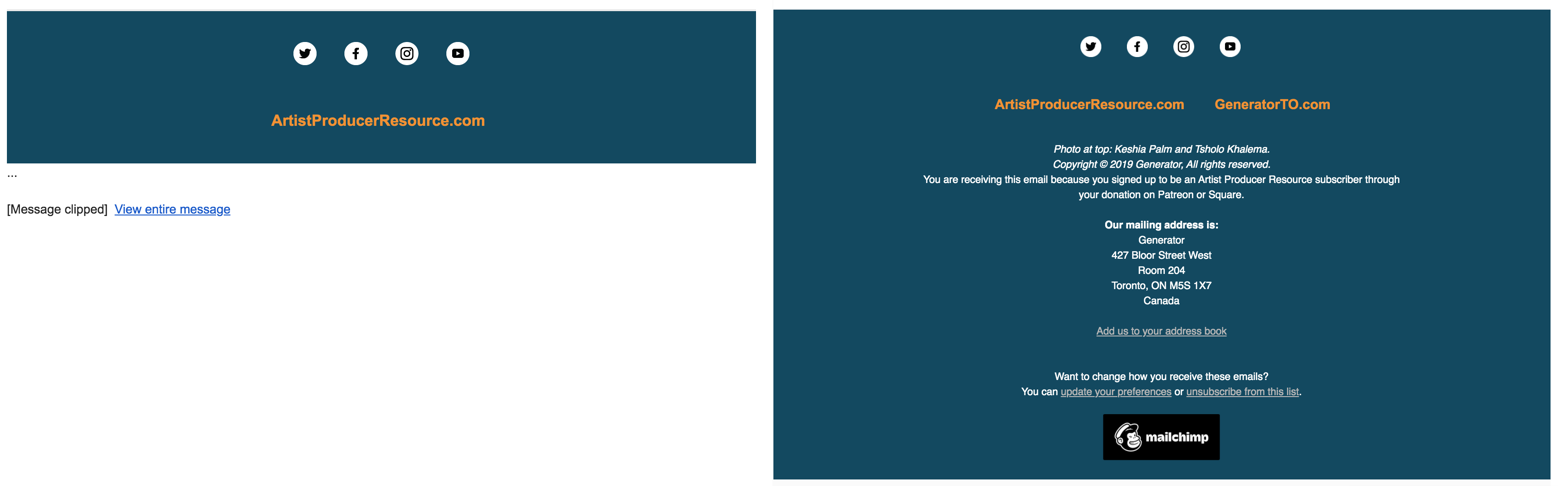 Left: The footer is cut off, meaning email recipients have to navigate away from the message to find the unsubscribe option (not so good). Right: full footer appears, including an option to unsubscribe (good).