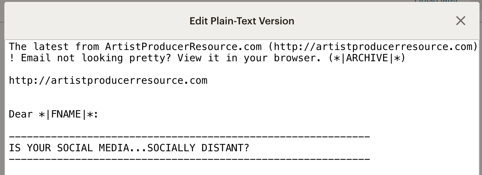 Some people have settings on their email that prevent them from seeing it in all your beautiful, HTML-designed glory. Spend a few minutes cleaning up the plain text version of your email so that it's still legible for plain text users. Beware extraneous asterisks, line breaks, links in the middle of sentences, etc.