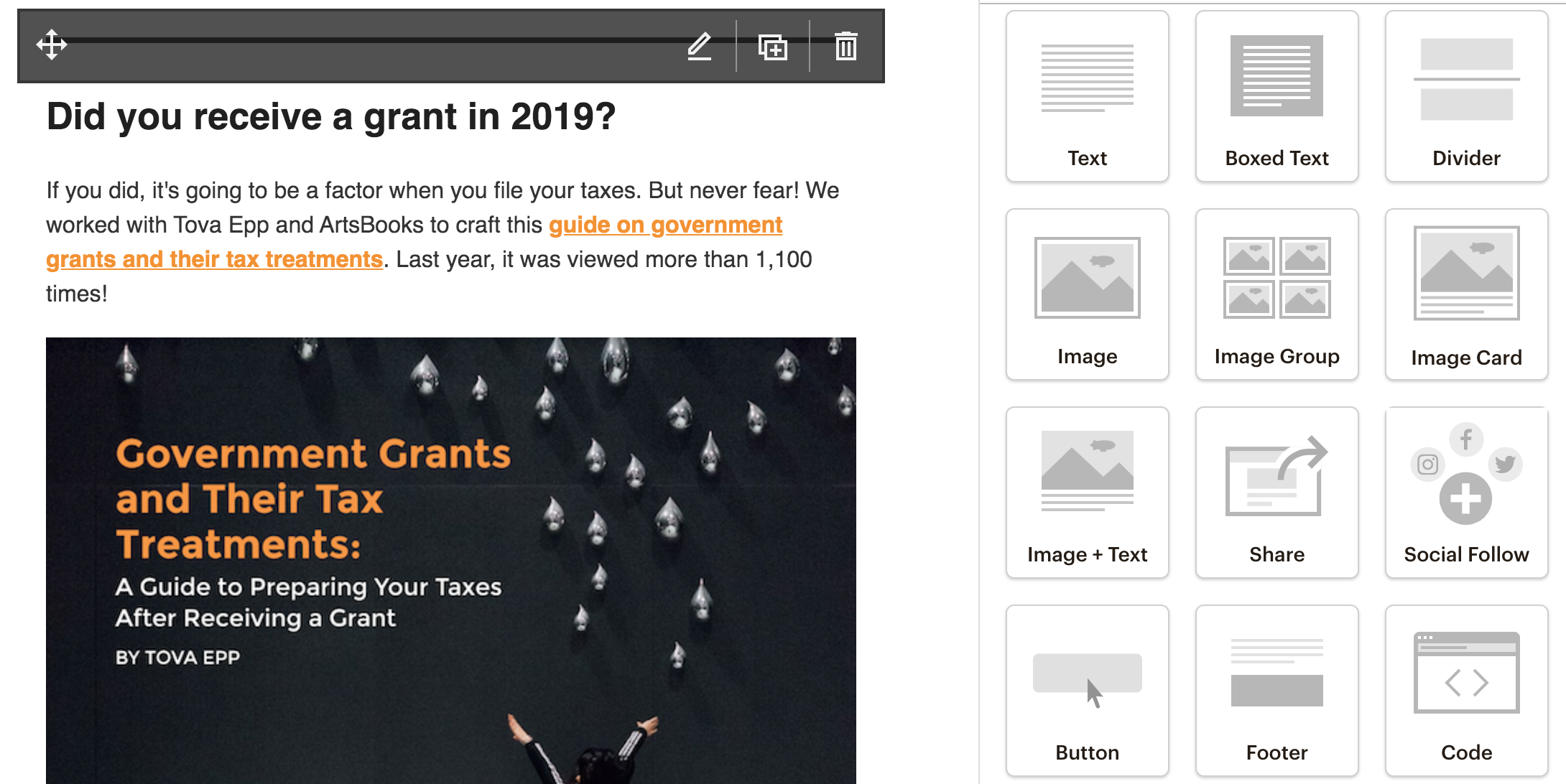 Screenshot from Mailchimp: this is what it looks like when you go to build or edit your newsletter!