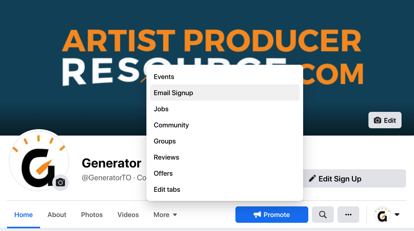Screenshot of Generator's Facebook page with a pop up edit menu. %22Email Sign-up%22 is highlighted.