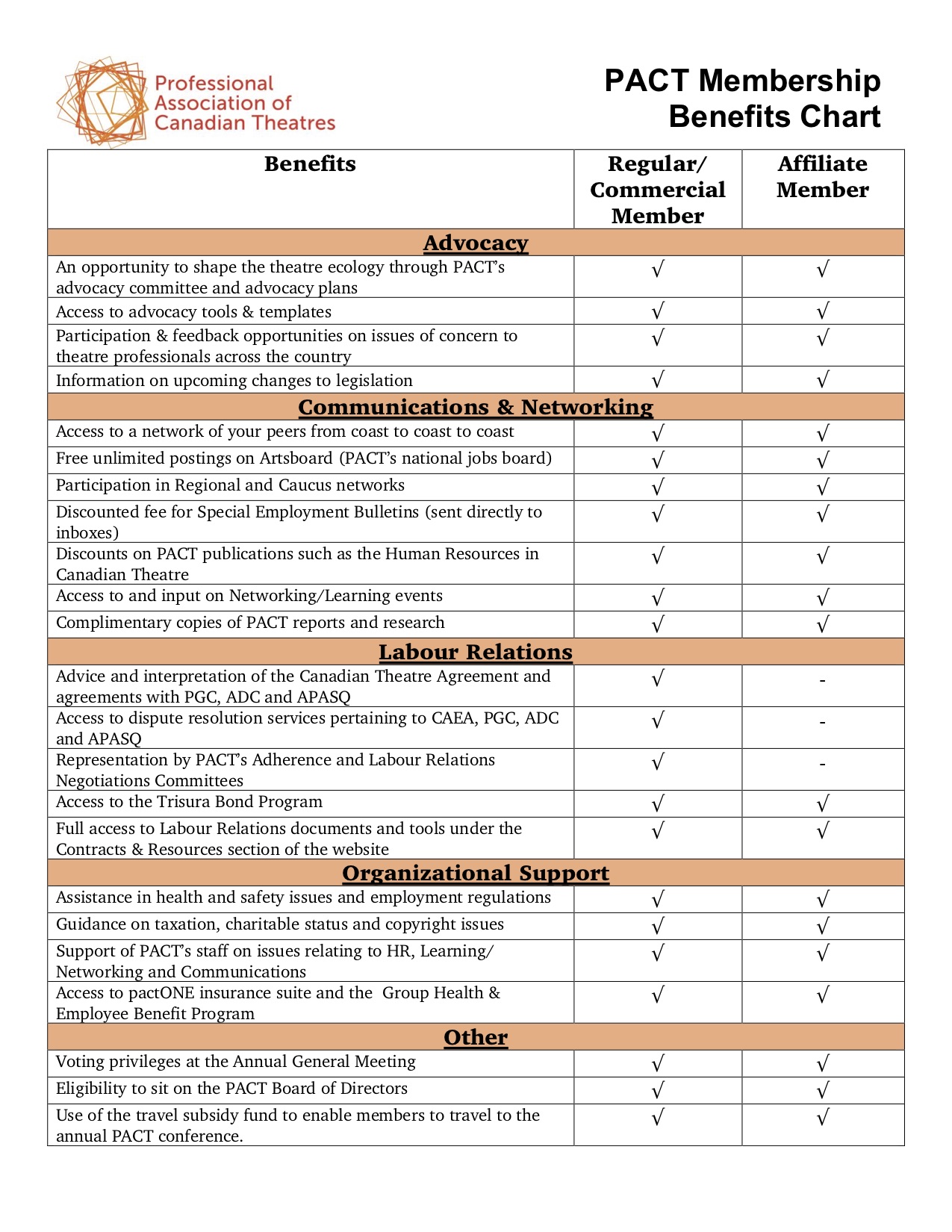 PACT is an association for professional theatre companies only; this means that all artists your company engages must receive payment for their work. It is a member driven organization that supports the well being and betterment of Canadian Theatres.
