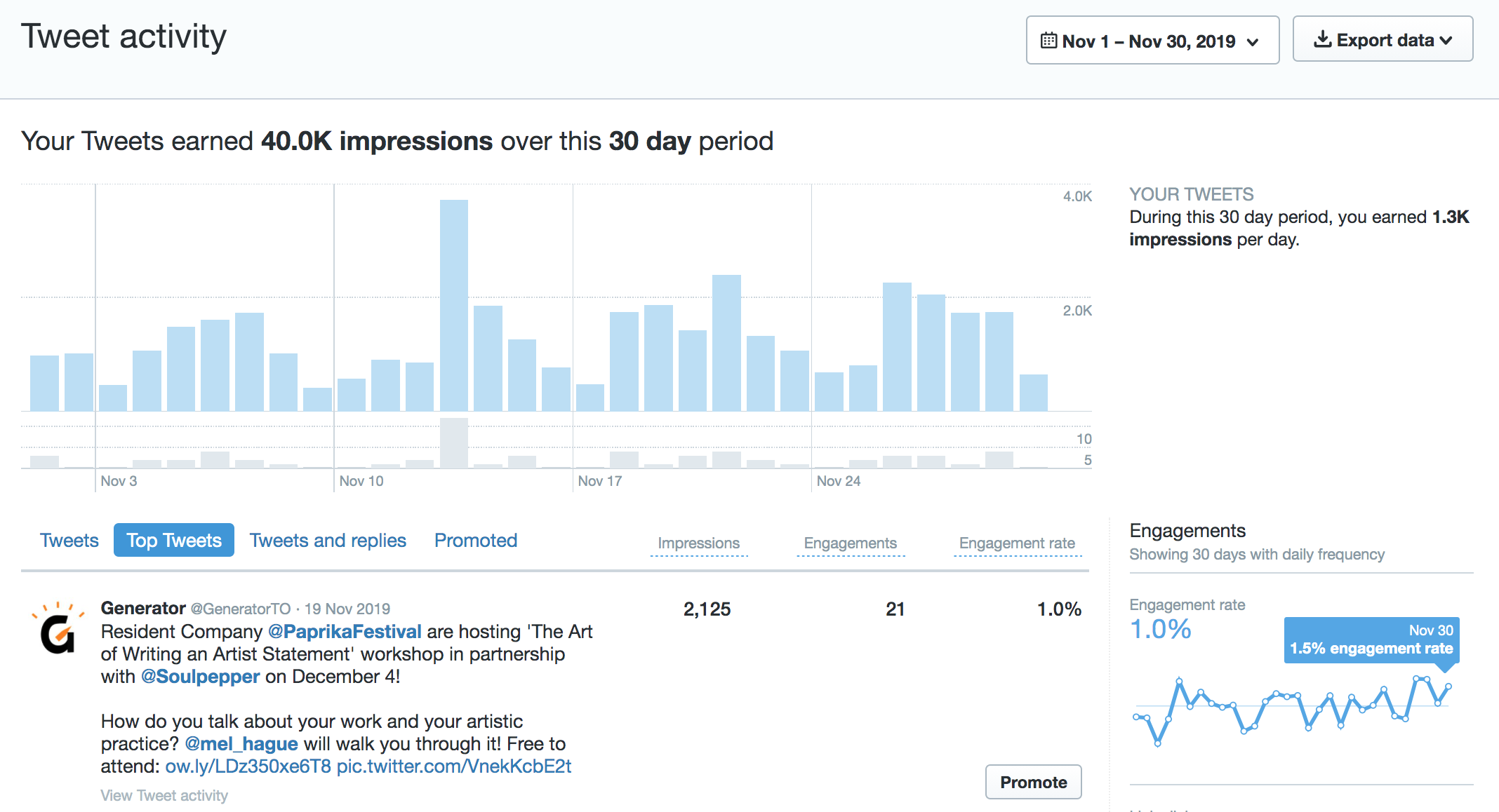 Should you invest in boosted posts and social media ads? There is no definitive answer as to whether or not your social media advertising dollars equate to more people at your show. But they can help your content be seen by more eyes and can sometimes be more cost-effective than printing postcards and posters - especially since you can be really specific about who you're targeting. If you’re hesitant about advertising, try investing a few dollars to boost a post. Facebook, Instagram, and Twitter will all provide you data about how many people saw that ad, what percentage of people saw it because you paid, and how many people clicked through.